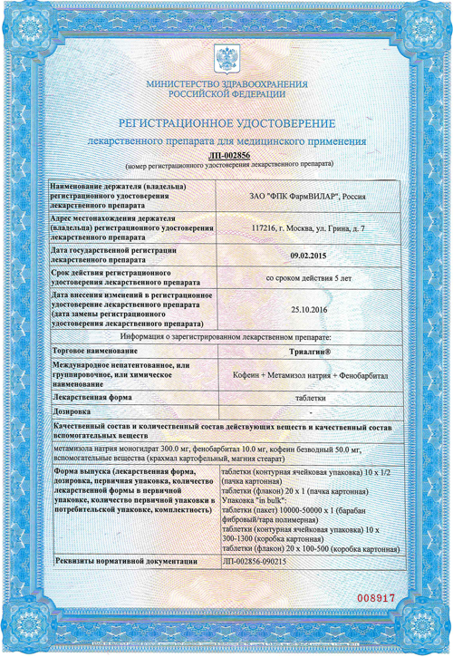В состав Триалгина входят три активных компонента: метамизол натрия 300 мг, фенобарбитал 10 мг, кофеин 50 мг